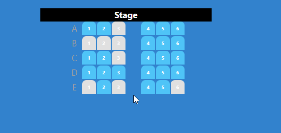 Lets start with something really cool. A (very simple) seat map for our events! We want fans to be able to select the seats they want to purchase. For this, we’ll be using a custom seat picker component! Take a look below for an example: